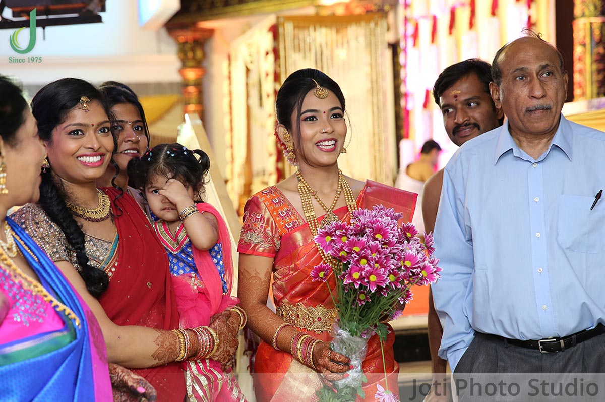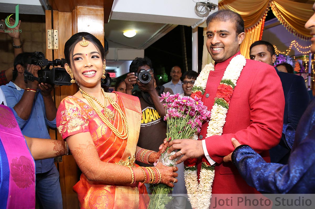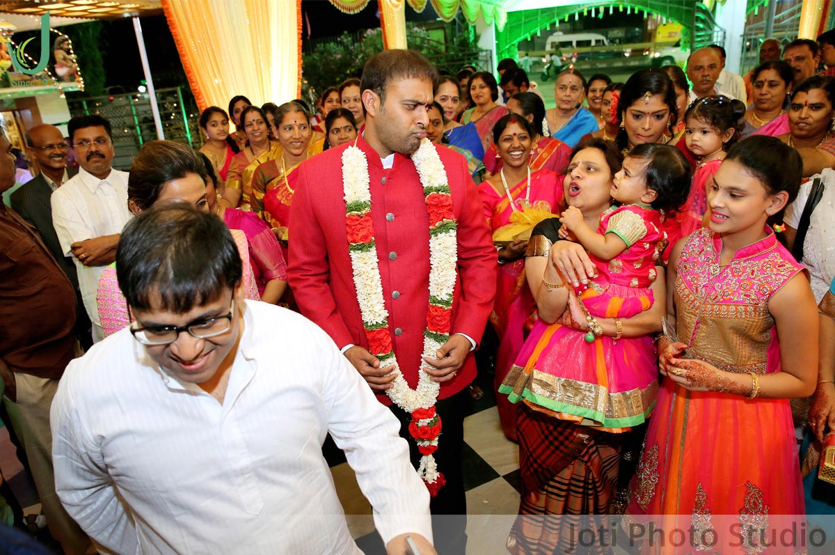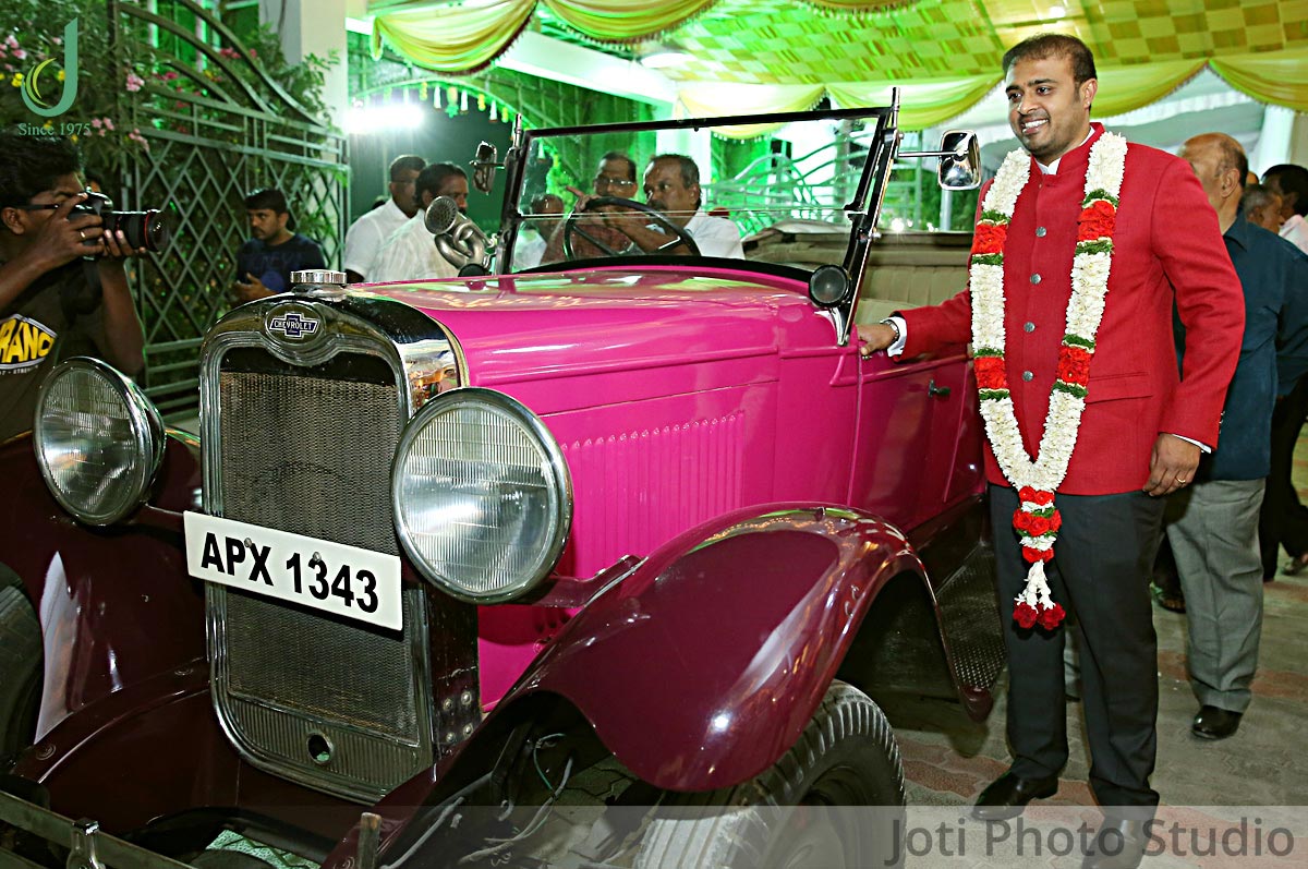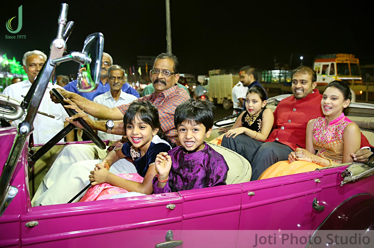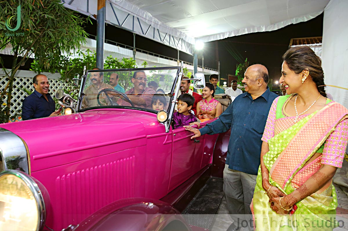 Ashwanth looked stunning in his red attire and was all set to take a drive on the pink vintage car. After the exciting drive the groom was welcomed by the bride who was equally looking gorgeous. The dazzling couple were then made to sit on a swing following which there was a lot of fun and entertainment in the mandap.